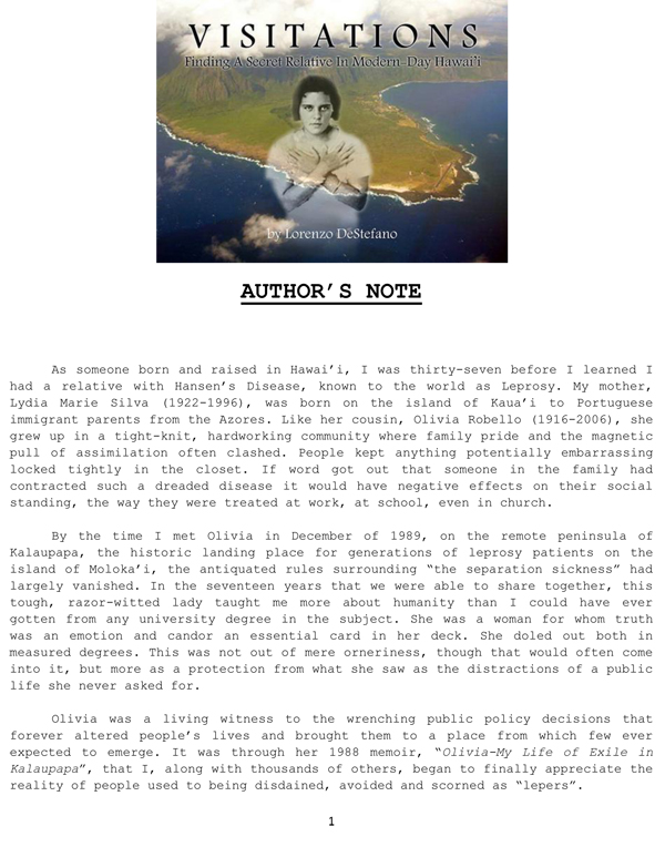 VISITATIONS – Finding A Secret Relative In Modern-Day Hawai’i” by Lorenzo DeStefano www.visitationsmemoir.com / info@visitationsmemoir.com (805) 641-3845 / 805 302-2480